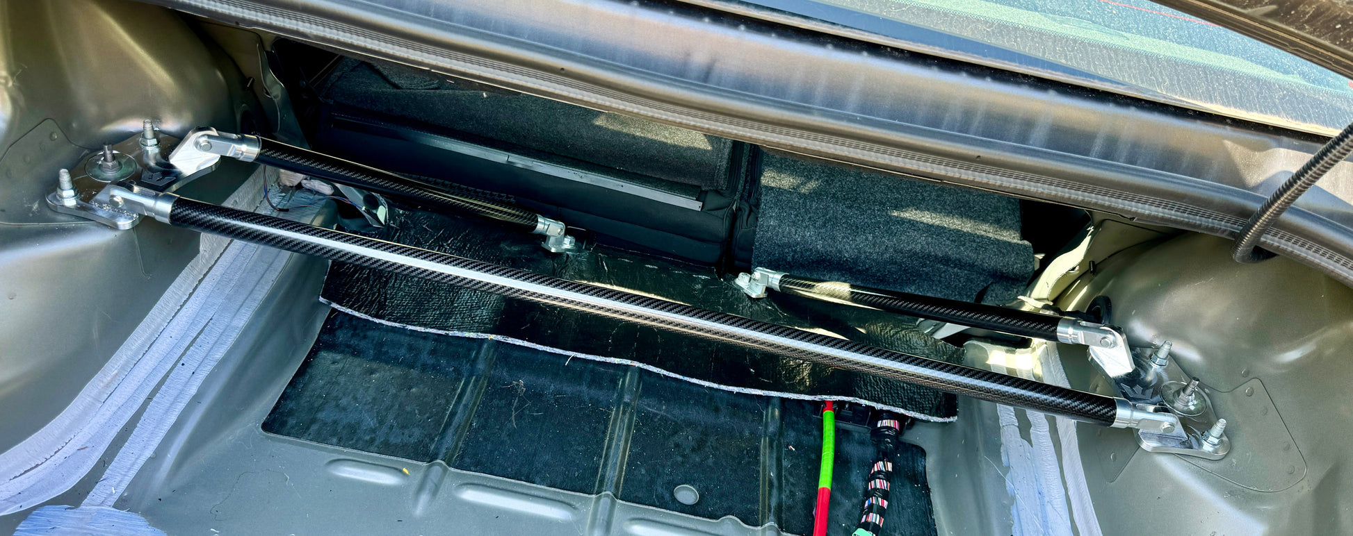 Our 4-point carbon fiber rear trunk brace is made in the USA from genuine carbon fiber tubes that connect to CNC machined billet aluminum mounting plates at the shock towers and rear seat base with quick release zinc plated pins for easy removal.